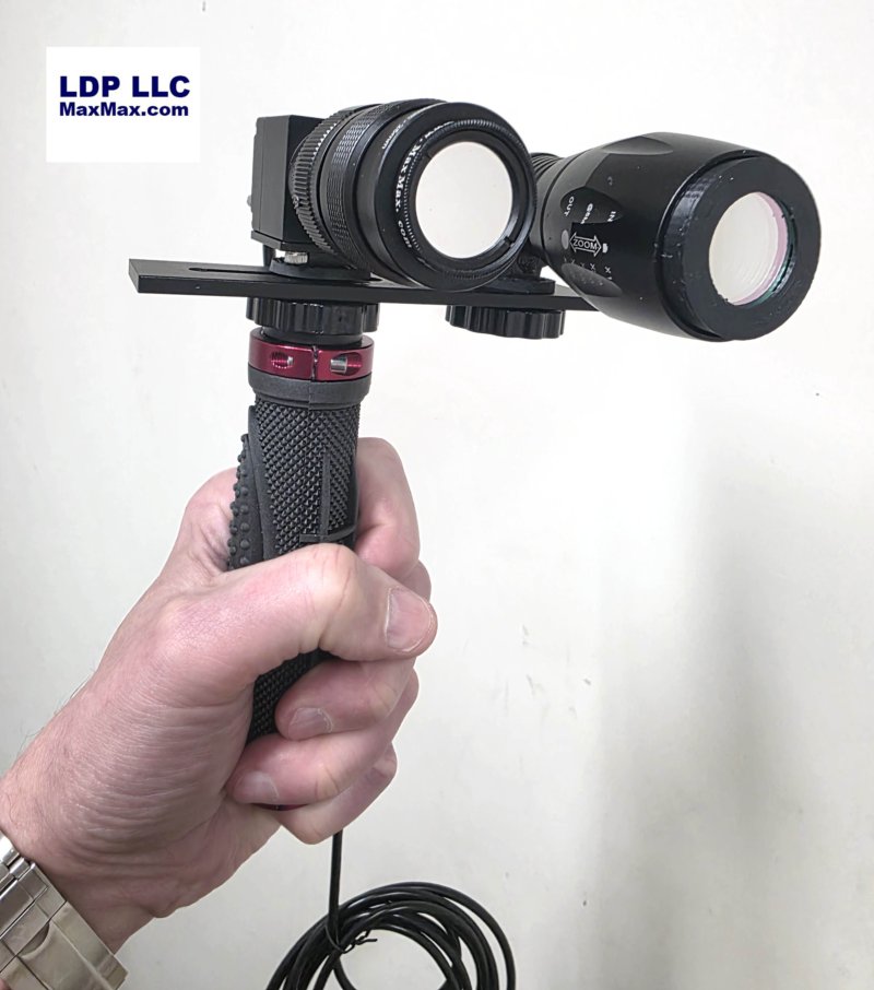 By combining both our ICG camera and flashlight on one handheld bracket, it is much easier to manage the pointing and aiming of the two devices. Once you set your flashlight focus and allignment with the camera, you image ICG with easy effort.