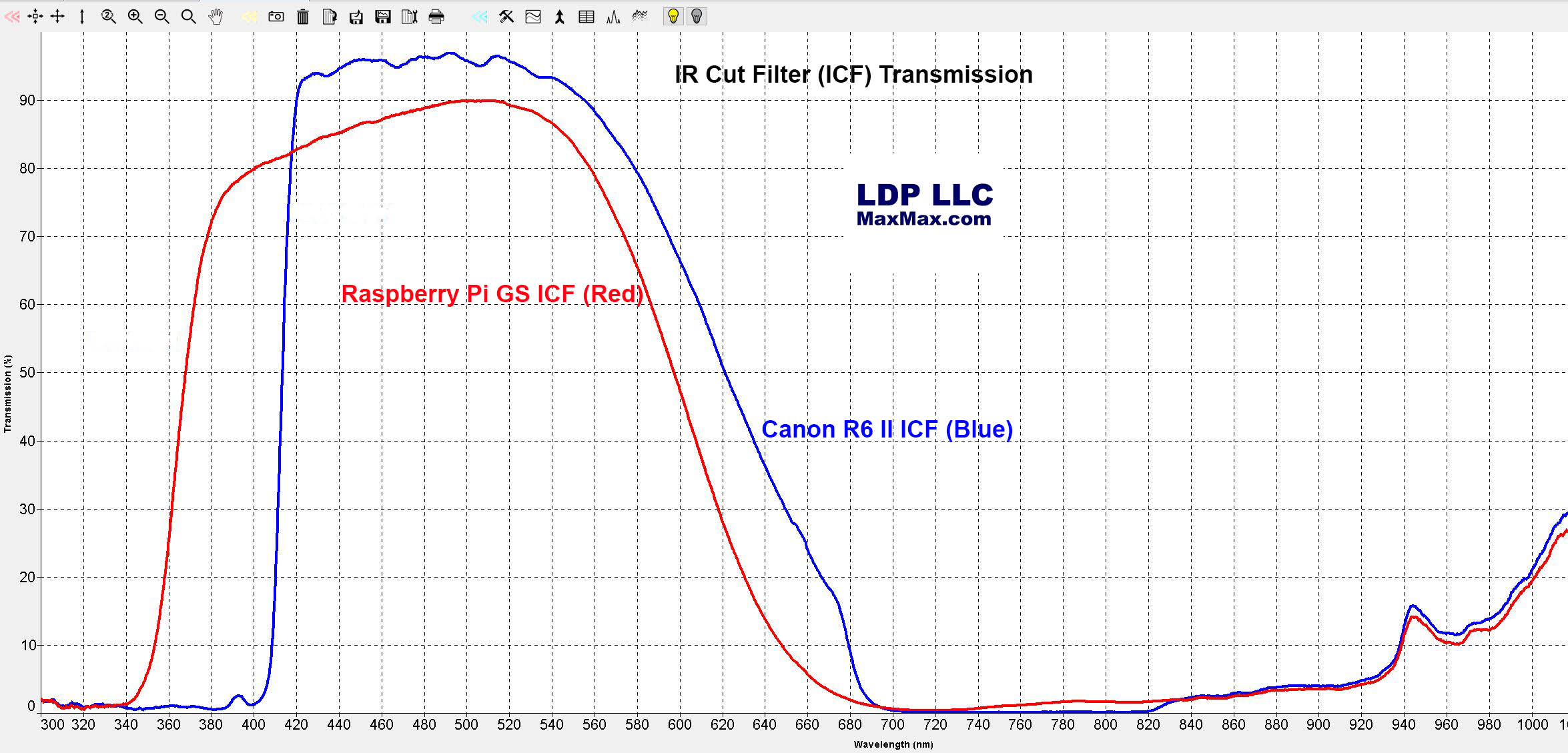 In the above graph, you can see how the RPI GS ICF rolls off in the UV versus a Canon R6 II ICF.