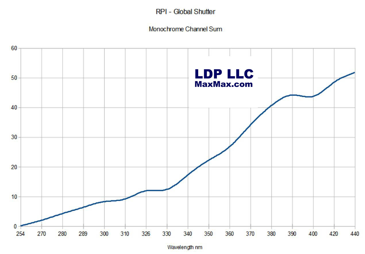 For extended UV response down below 250nm, the RPI GS sensor needs to be converted to monochrome which removes the coverglass, microlenses and Color Filter Array (CFA). The coverglass, microlenses and CFA all block or reduce UV light. With a color RPI GS with no ICF, you can get decent UV response down to about 350nm though not as good as the monochrome RPI GS with no ICF.