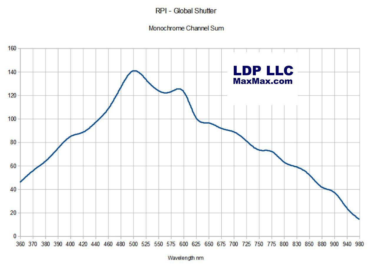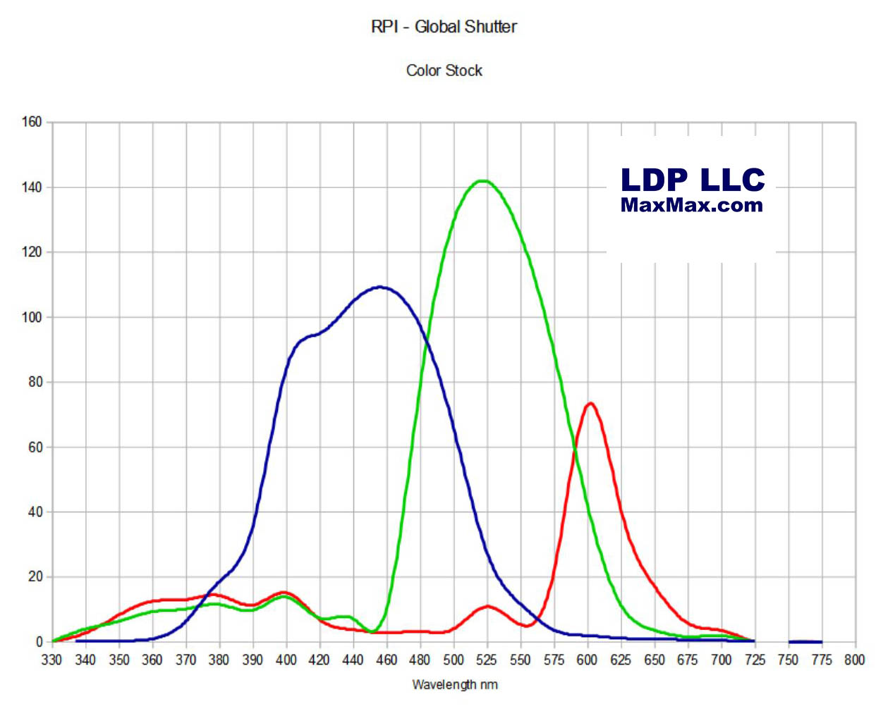 Notice that the stock RPI GS camera has significant response below 420nm, which is the typical digital camera cut off point. The typical digital camera has a 'brick wall' around 420nm. The RPI GS camera uses BG38 glass which passes some UV. Normally, digital cameras which use BG38 glass have coatings on the glass to restrict the UV and IR response. Sometimes, cameras have two layers of glass - one BG38 and one vapor deposition coated.